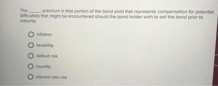 Yield to Maturity (YTM) - Definition, Formula, Calculations Use the below-given data for calculation of yield to maturity. Coupon on the bond will be $1,000 * 7.5% / 2 which is $37.50, since this pays semi-annually. Yield to Maturity (Approx) = ( 37.50 + (1000 - 1101.79) / (20 * 2) )/ ( (1000 + 1101.79) / 2) YTM will be - This is an approximate yield on maturity, which shall be 3.33%, which is semiannual. Yield to maturity - Wikipedia Formula for yield to maturity for zero-coupon bonds = ... Suppose that over the first 10 years of the holding period, interest rates decline, and the yield-to-maturity on the bond falls to 7%. With 20 years remaining to maturity, the price of the bond will be 100/1.07 20, or $25.84. Even though the yield-to-maturity for the remaining life of ... Yield to Maturity Calculator | Calculate YTM In the yield to maturity calculator, you can choose from six different frequencies, from annually to daily. In our example, Bond A has a coupon rate of 5% and an annual frequency. This means that the bond will pay $1,000 * 5% = $50 as interest each year. Determine the years to maturity The n is the number of years from now until the bond matures. Solved 5. The yield to maturity on a bond is - Chegg A. time to maturity. B. coupon rate. C. yield to maturity. D. B and C 7. Holding other factors constant, the interest-rate risk of a coupon bond is higher when the bond's: A. term-to-maturity is higher. B. coupon rate is higher. C. yield to maturity is higher. D. all of the above 8.